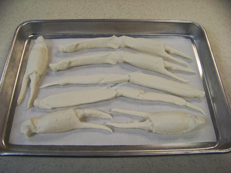 I dusted with CK Petal Dust layering on different colors. First I started with Cappuccino (front claw) then added a layer of Sunflower (second claw) then added a layer of orange (third claw) and finally dusting the tip of the claw and large spines with charcoal. The back claw in the picture is a real crab let for a color guide; looking at the real claw with you dust. Avoid dusting the "V" shaped areas you will notice on the real leg it is almost transparent looking. Also avoid the end of the legs/claws where meat would be showing.